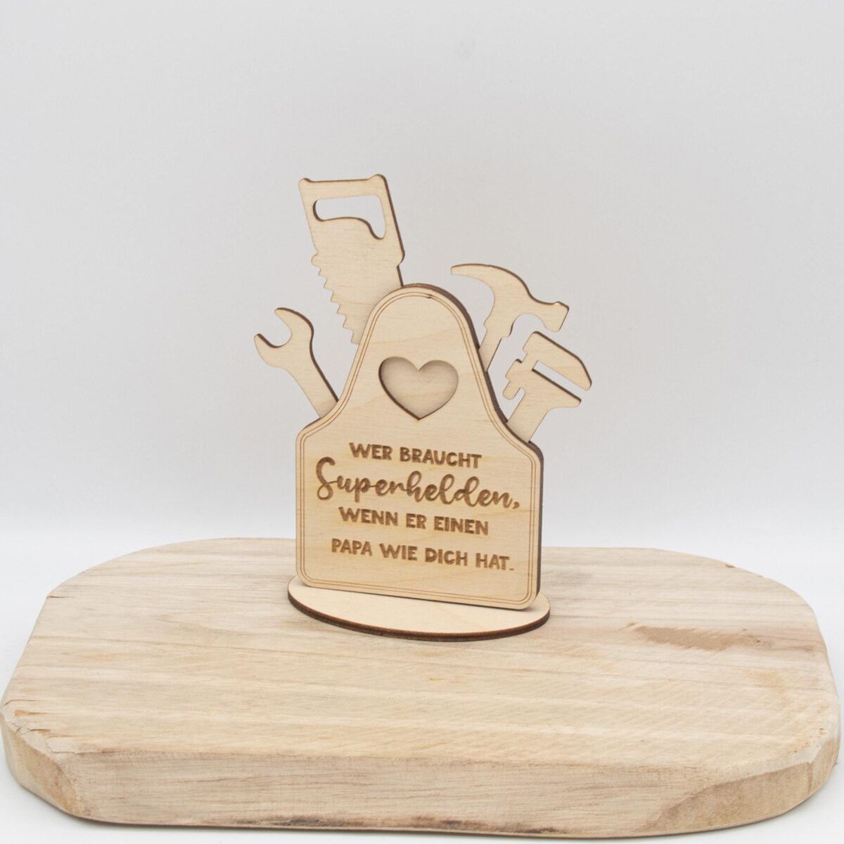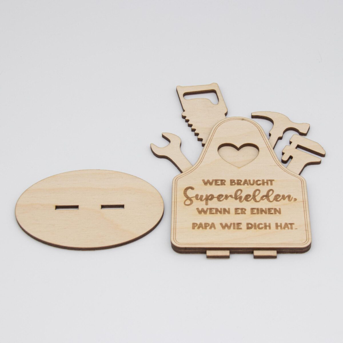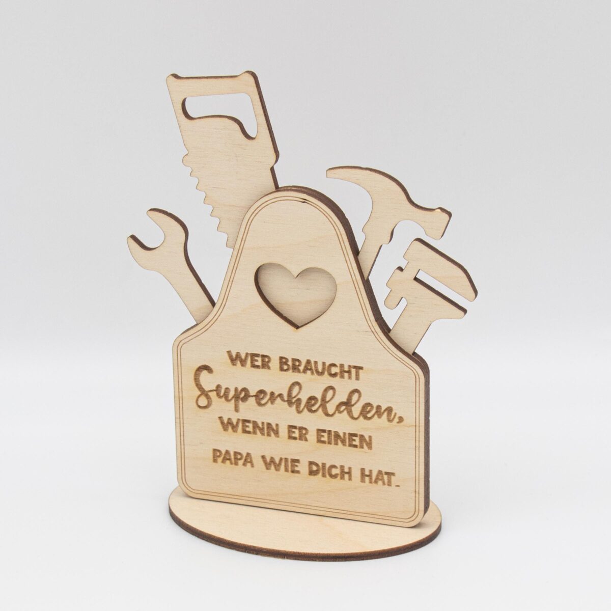Ein echter Hingucker für jeden Heimwerker-Fan! Unser handgefertigter Aufsteller aus hochwertigem Birkensperrholz im detailgetreuen Werkzeugkoffer-Design ist das perfekte Geschenk für den Vatertag oder einfach, um Papa zu zeigen, wie viel er dir bedeutet.