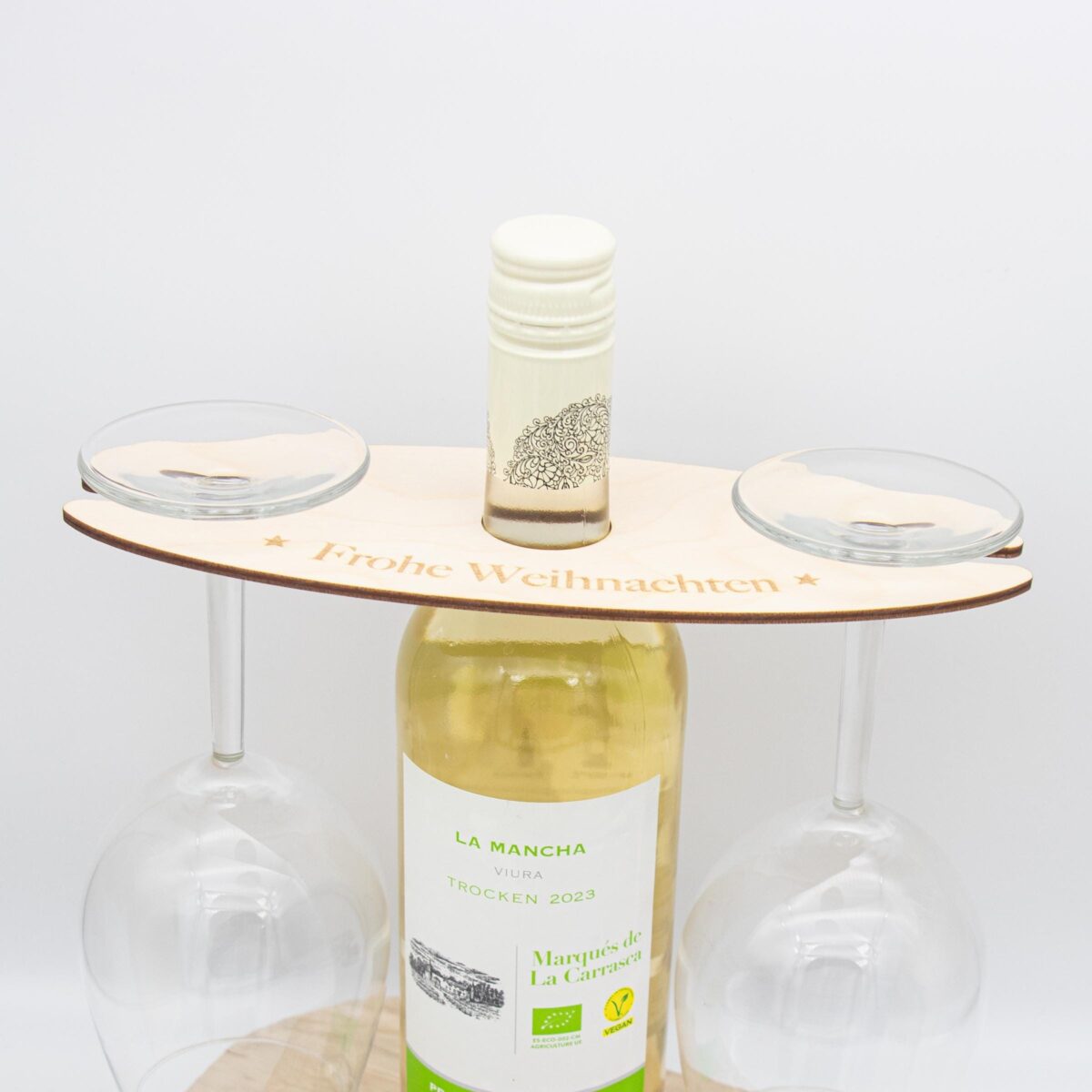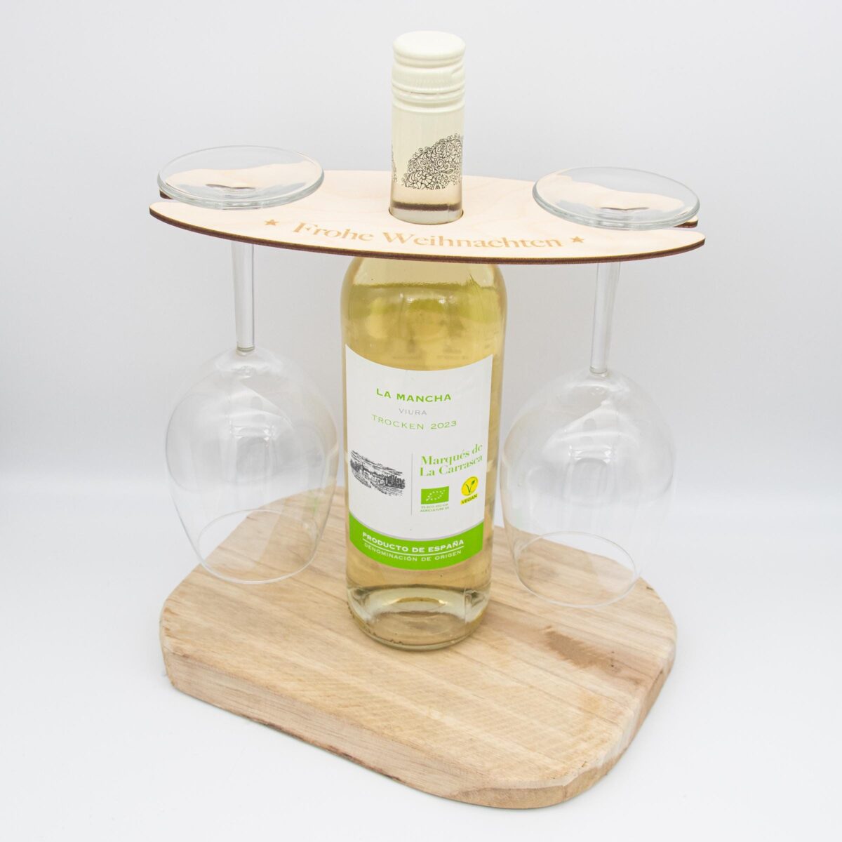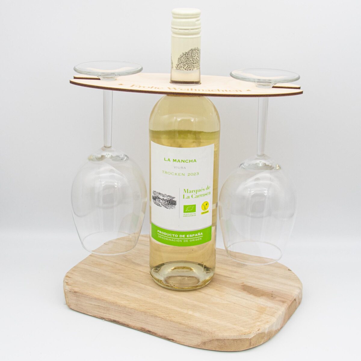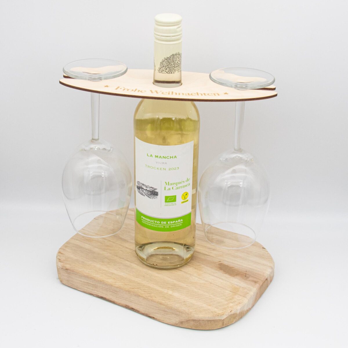 Dieser elegante Weinhalter wurde mit viel Liebe zum Detail aus hochwertigem Holz gefertigt und bietet Platz für eine Flasche Wein und zwei Gläser. Das minimalistische und funktionale Design macht ihn nicht nur zu einem praktischen Accessoire, sondern auch zu einem wahren Hingucker.